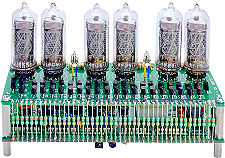 A traditional Nixie-tube digital clock display is brought right up to date with a 32-bit microprocessor and the addition of (optional) GPS-derived time setting to automatically determine the time zone around the world. Auto dimming of Nixie tubes and additional mood lighting supplied by blue leds. Date display, 7-day alarm and battery backup.