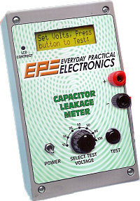 This PICmicro powered test gear lets you perform a leakage current test on almost any type of capacitor, including ceramic, polyster, mica, tantalum or aluminium electrolytics.  Seven standard test voltages are available from 10V to 100V allowing most capacitors to be tested at their rated voltage. Leakage currents from 100nA to almost 10mA can also be tested.  Informative LCD alphanumeric display all in a self-contained unit. Capacitor Leakage Current Guide Table also included.